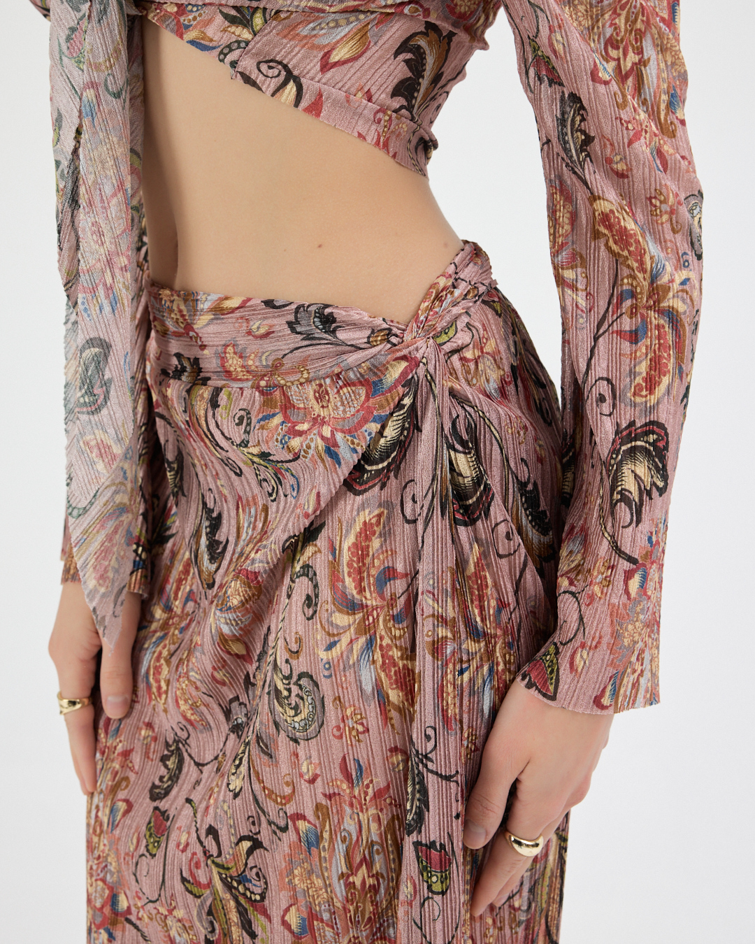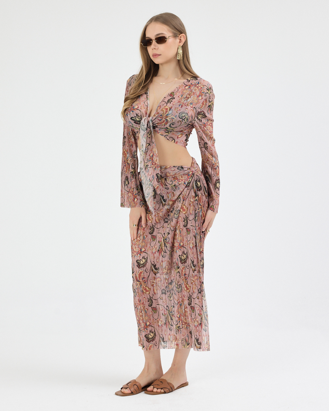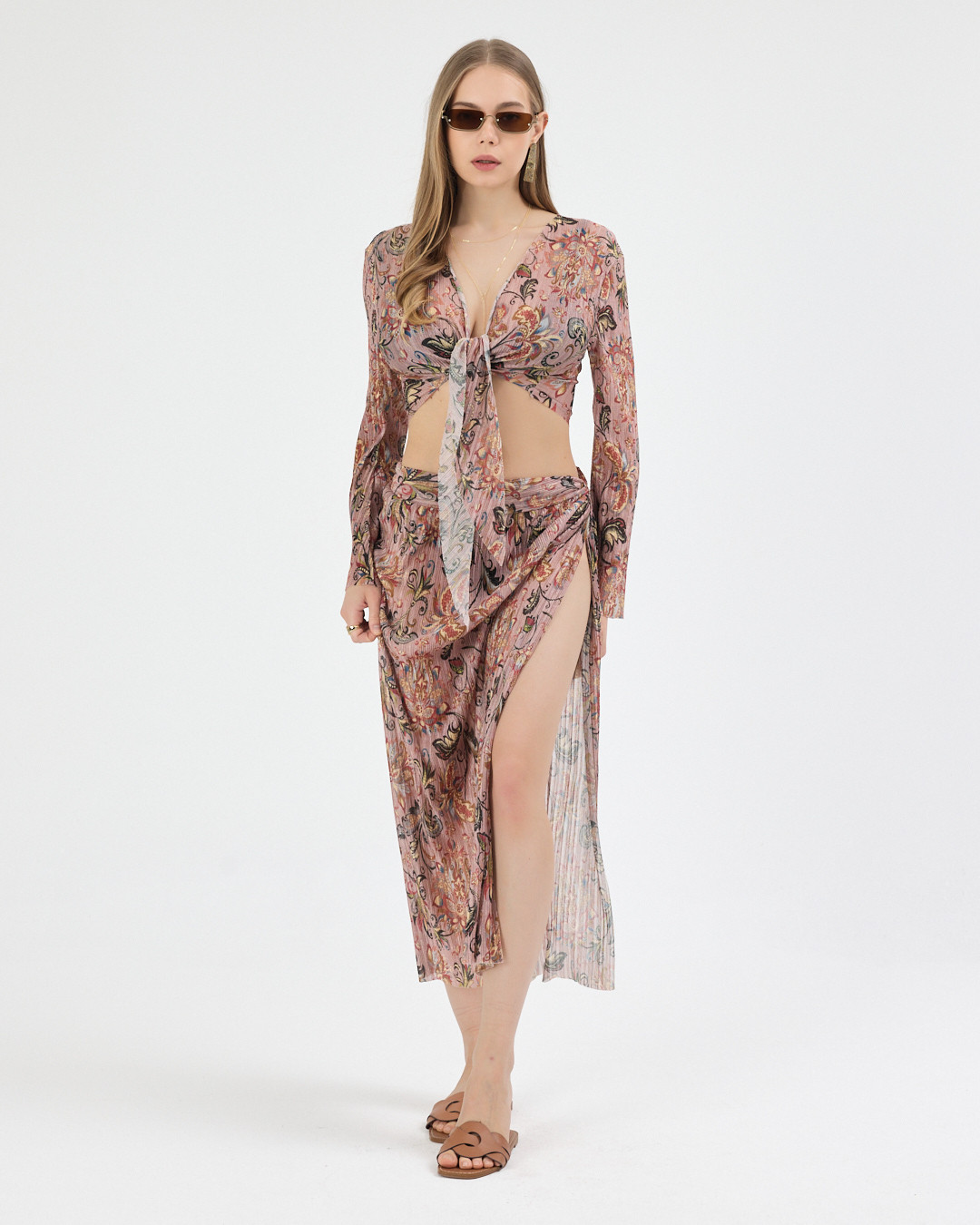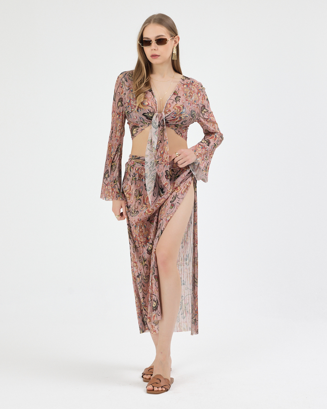 – Çapraz bağlama üst silueti ve yırtmaç detayları ile modern ve feminen bir stil oluşturur.
